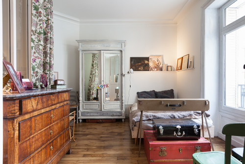 ボタニカルなカーテンやミラー付きのシャビーシックな収納棚、また、ピンクのトランクがアクセントになったフェミニン寄りのレトロモダンインテリア。